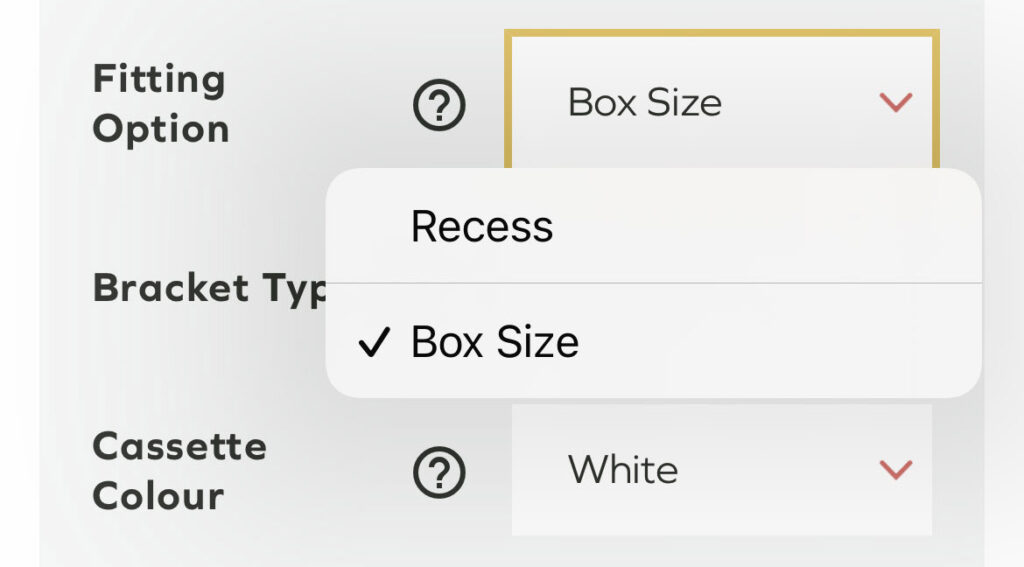 If your blinds will lie within the recess, select the “Recess” fitting option; if your blinds will sit outside the recess, select the “Box Size” fitting option. This lets us know to adjust the measurement to make room for the appropriate brackets.