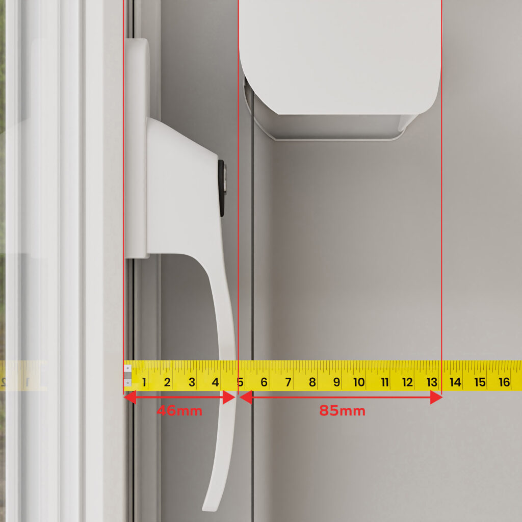 Example – For a window handle protruding 46mm from the window frame, the calculation for a top-fixed roller blind would be as follows: 85mm + 46mm = 131mm total depth.